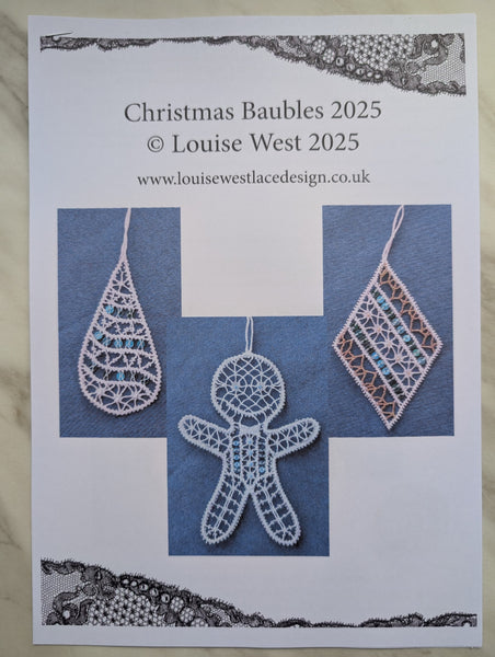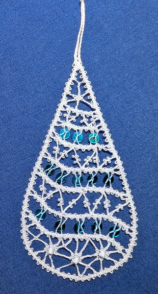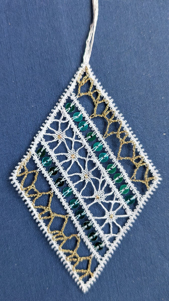 This pattern sheet is for three small decorations for the Christmas tree, a diamond shape, a tear drop shape and a gingerbread man. They are all made in Presencia Finca 60 thread (or equivalent 38wpc) with sequins and Delica beads for the gingerbread man. The first two use 4mm sequins and the gingerbread man 3mm sequins.