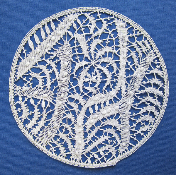 This round Bedfordshire motif was inspired by naturally occurring frost patterns on my car roof a few years ago and developed into this round motif. It is offered with few instructions to allow lacemakers to interpret it how they want it to be. It is a more advanced pattern by the nature of the design, and incorporated raised and rolled tallies on it, although it could be made with small sparkly beads instead to change the frosty appearance. It would also be interesting to work it in a colour.